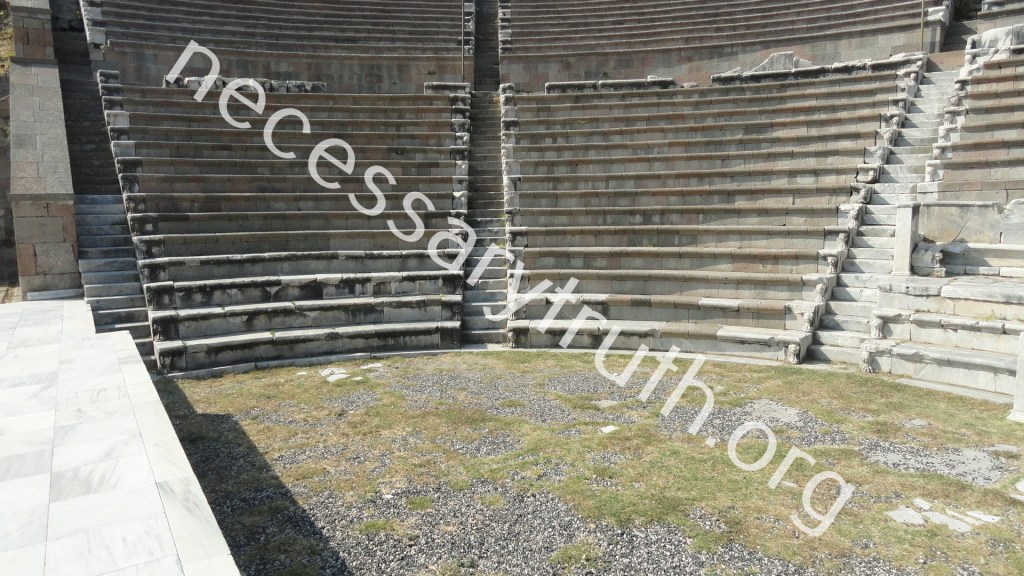 The difference between the Roman and Greco theatres are telling from up close. From a distance they both look the same. But the seats are differently made which is telling – if the theatre is Roman or Greek.